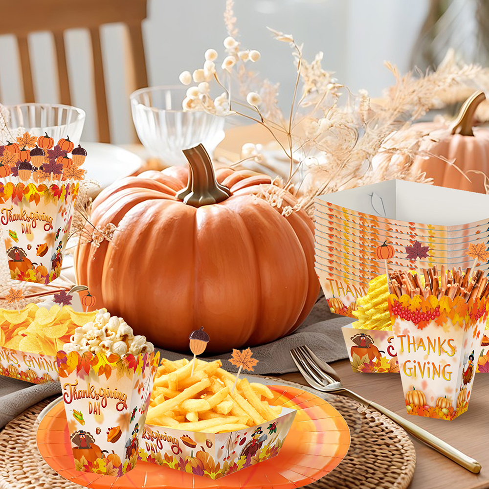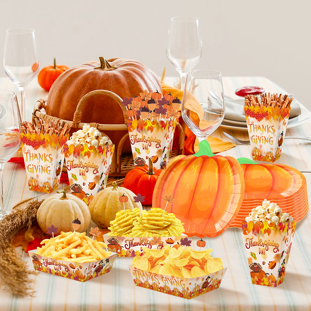 Package contents: 10 Pcs * Pumpkin Paper Plates 12 Pcs * Popcorn Boxes 12 Pcs * Food Trays 100 Pcs * Fall Cocktail Picks