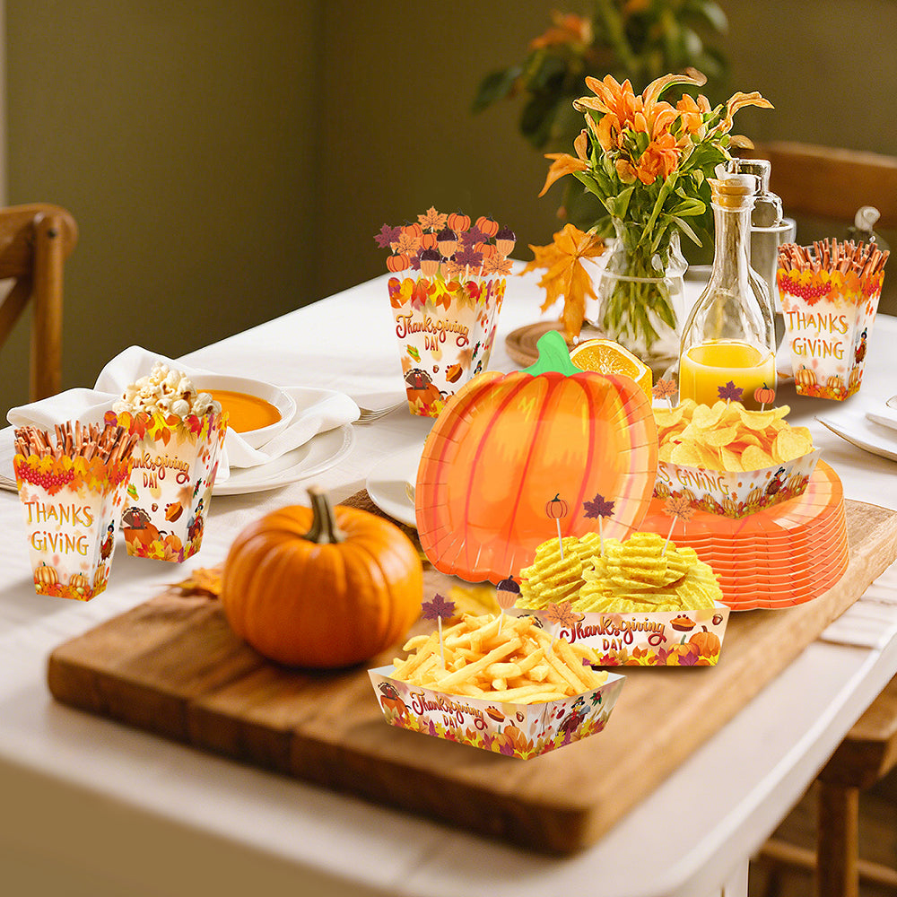 Make your Thanksgiving and autumn gatherings effortless with our 134-Piece Thanksgiving Party Tableware Set. This festive set includes pumpkin-themed paper plates, popcorn boxes, food trays, and fall cocktail picks, perfect for creating a cohesive and seasonal table setting. Designed for convenience, these disposable fall harvest dinnerware items make hosting stress-free while adding a charming autumn touch. Ideal for Thanksgiving, harvest parties, and fall celebrations, this set brings style, functionality, and seasonal cheer to any holiday meal.
