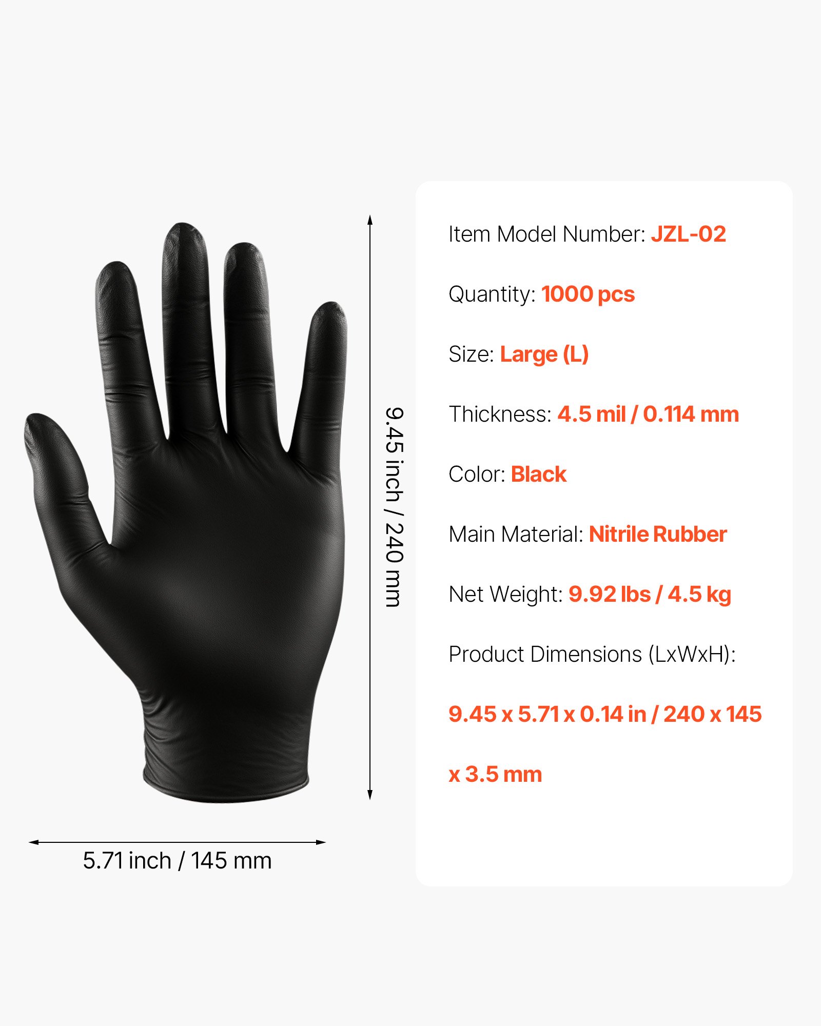 Protect your hands with Black Nitrile Disposable Gloves designed for superior performance and comfort. These 4.5 Mil thick gloves are latex and powder-free, making them ideal for those with sensitive skin. Perfect for a wide range of uses, including medical, cleaning, food handling, and industrial tasks, these gloves provide a strong barrier against dirt, chemicals, and contaminants. The large size (L) offers a comfortable fit for most hands, while the nitrile material provides excellent puncture resistance and flexibility. Whether for professional use or everyday tasks, these disposable gloves offer reliability and durability when you need it most